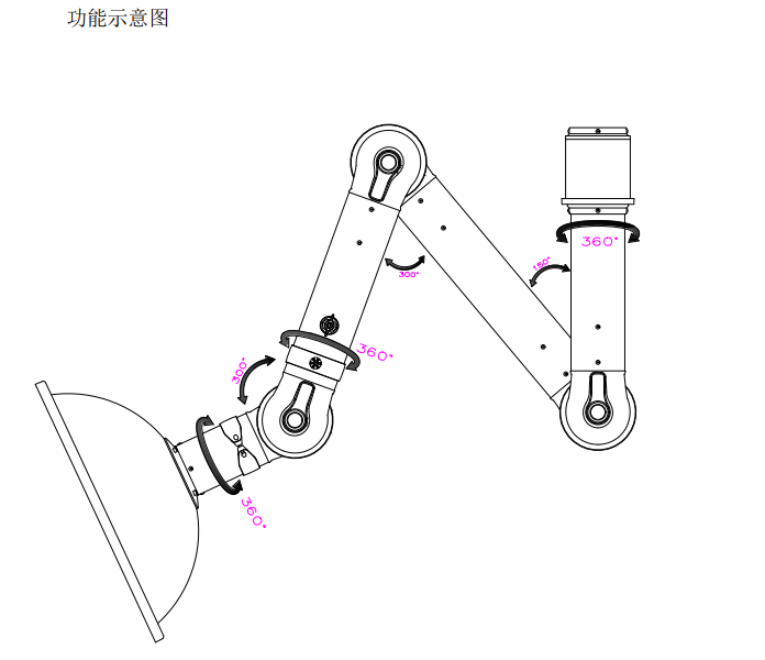 *活動(dòng)功能:配備三組折疊關(guān)節(jié),折疊角度75-300°,一個(gè)水平360°旋轉(zhuǎn)、二個(gè)末端軸向360°旋轉(zhuǎn)功能;(zl****)